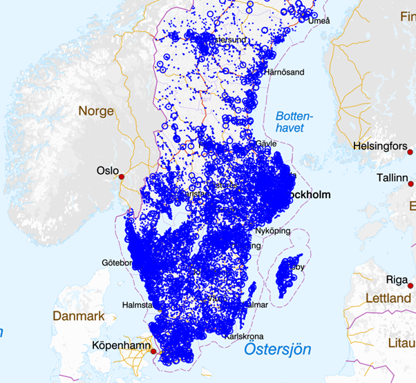 Figur 1. Det finns över 700 000 bergborrade brunnar i Sverige varav ca 60% används för energiändamål och ca 40% är vattenbrunnar av olika slag (Källa: SGU:s Brunnsarkiv).