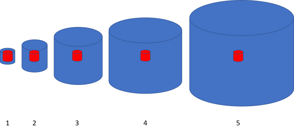 Figur 3. Illustration av räckvidden för enskilda prover i olika medier; (1) jord, (2) sediment, (3) porgas, (4) grundvatten och (5) ytvatten. De röda cylindrarna har samma storlek och illustrerar provets faktiska volym. Blå cylindrar illustrerar schematiskt hur stor räckvidd ett prov kan ha i olika typer av medier. Observera att figuren inte är skalenlig utan syftar till att illustrera ett tankesätt.