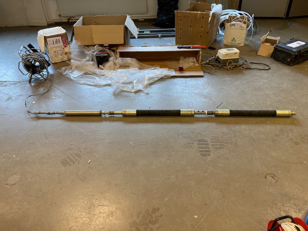 Figur 1. Tryckmanschett med pumpar. Pumpen (MP-1) är monterad tillsammans med de två manschetterna (svarta gummiliknande delar), ca 80 cm långa vardera. Total längd på hela anordningen blir ca 1,6 m. Provintaget syns som hål mellan de två manschetterna. Denna uppsättning är använd i 115 mm hammarborrat hål. För att bestämma provdjup har optisk och akustisk filmning genomförts för att identifiera sprickzoner. Foto: Ramboll Sweden AB.