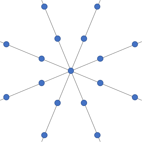 Ovanstående provtagningsmönster kan även användas då syftet är sökning eller avgränsning men det finns andra provtagningsmönster som kan vara mer effektiva för dessa syften. För avgränsning presenterar SGF (2013) ett provtagningsmönster för radiell provtagning; se Figur 1 ovan.
