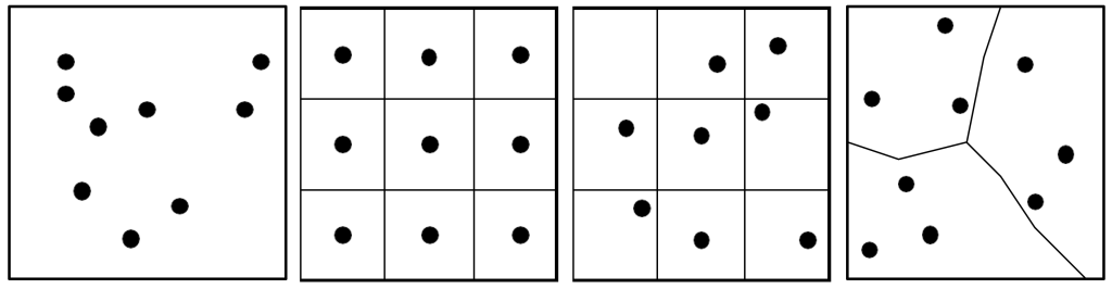 Figur 3. Exempel på sannolikhetsbaserade angreppssätt för provtagning: enkel slumpmässig provtagning, systematisk provtagning, systematisk slumpmässig provtagning samt stratifierad slumpmässig provtagning (efter Back, 2000). Notera att i exemplen är avsikten att skatta medelhalten inom respektive stor kvadrat och ej de mindre rutorna.